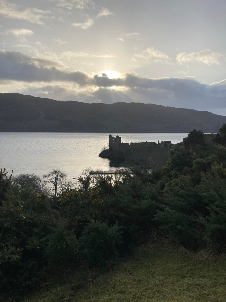 I wanted to video myself doing a reading from The Lady of the Loch, and I’d planned to do it on the old stone steps of Urquhart Castle but when I arrived, the kind man on the gates said they had no electricity and the castle would be closed for a few hours. So I clambered over a fence and legged it down towards the loch to do my reading there, where the setting was just right. Here’s the view from where I was standing.