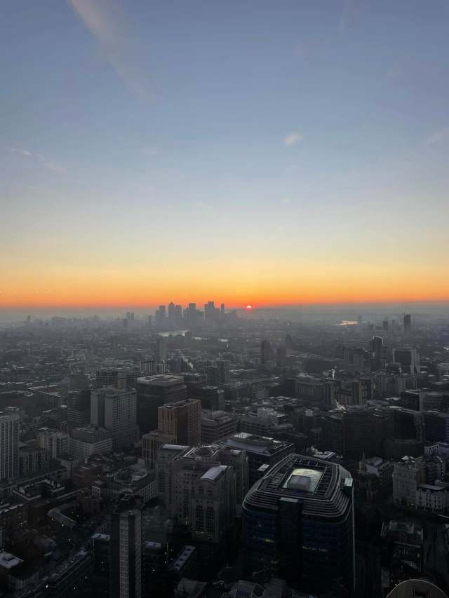 A few days ago, I went up to London to have breakfast at sunrise. I’d recommend the experience so much. The views were spectacular. We went to The Duck and Waffle in Bishopsgate. The service was great. The sunrise was special. The food wasn’t marvellous and if you’re a vegan, some items can be ‘made vegan’ by removing the egg and replacing it with nothing. But I’m used to dietary inequality. Besides, I went for great company and a breathtaking view of the gherkin and the river as the sun comes up over the Thames. What a view!